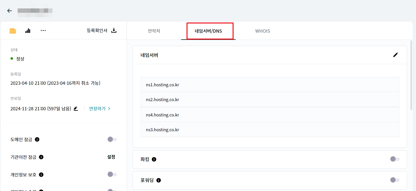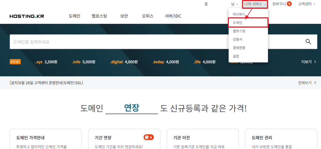 1. After logging in to Hosting KR, go to My Service > Domain Management on the right.