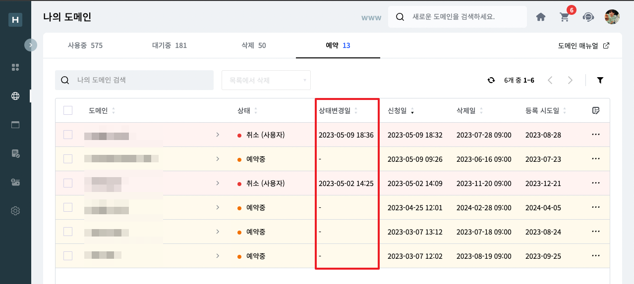 나의 예약 도메인 목록에서 상태변경일을 기준으로 도메인 조회