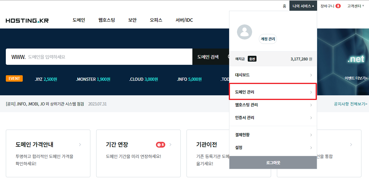 1. 호스팅케이알에 로그인 후 나의서비스>도메인관리로 이동합니다.