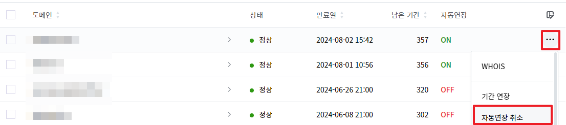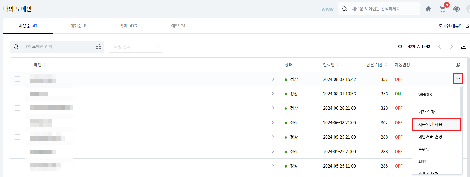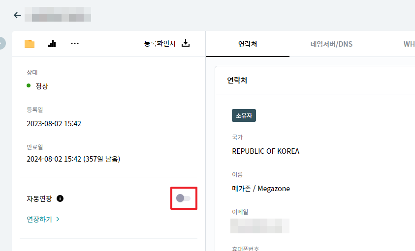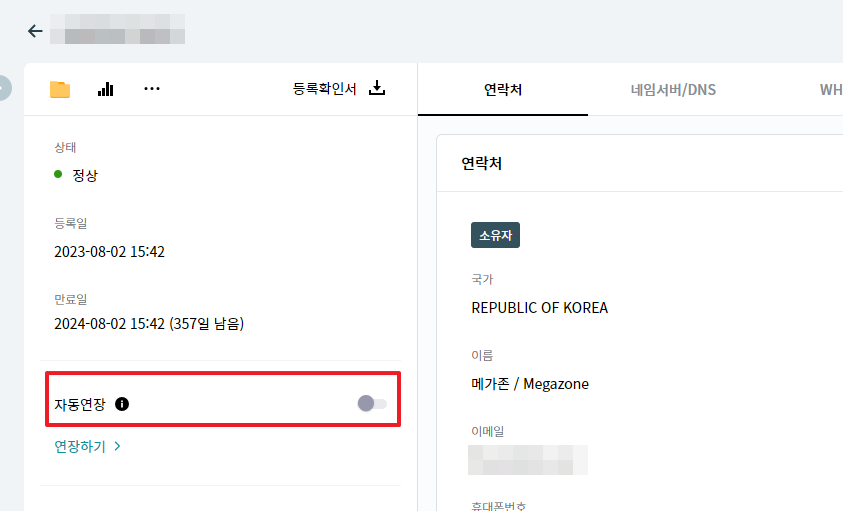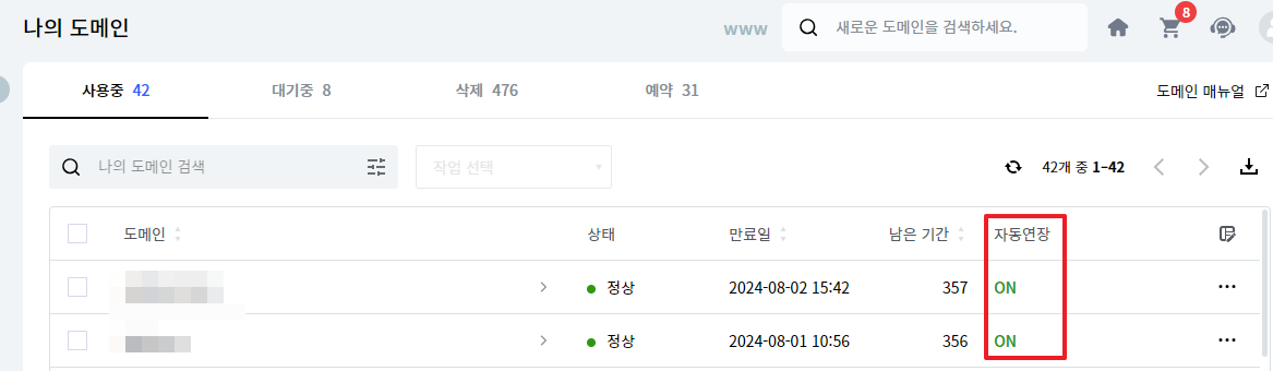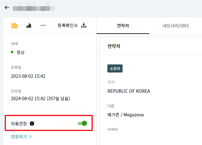 또는 도메인명을 클릭한 후 자동연장을 활성화 합니다.