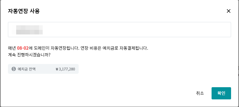3. 도메인명과 예치금잔액을 확인하신 후 '확인'버튼을 클릭합니다.