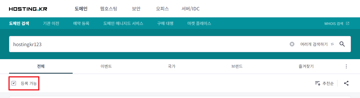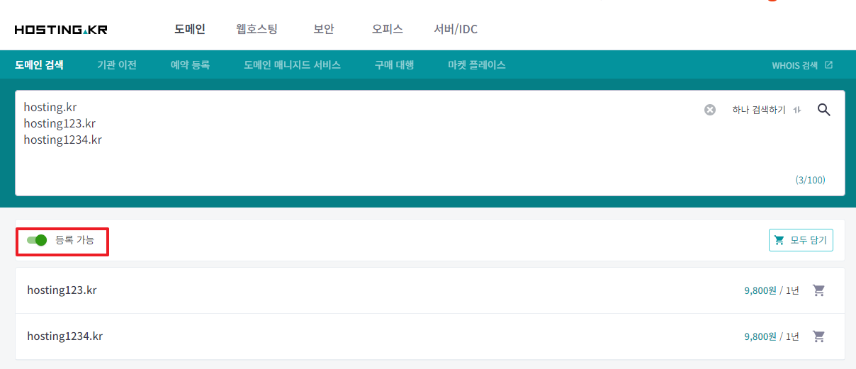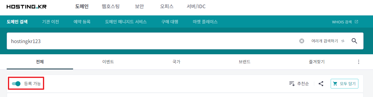 도메인 여러개 검색 모드에서 ‘등록가능’ 필터 제공