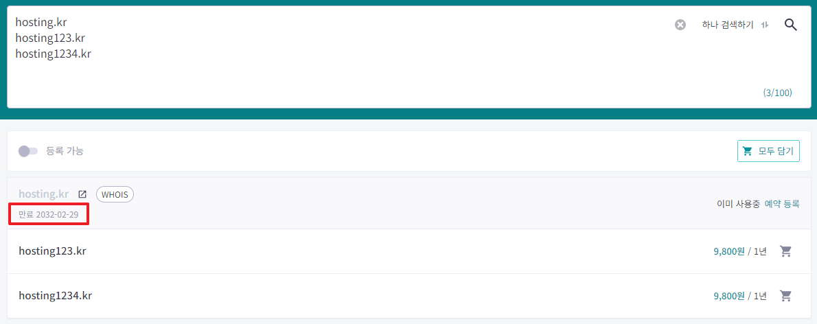 이미 등록된 도메인일 때 검색결과에서 바로 만료일 조회 가능