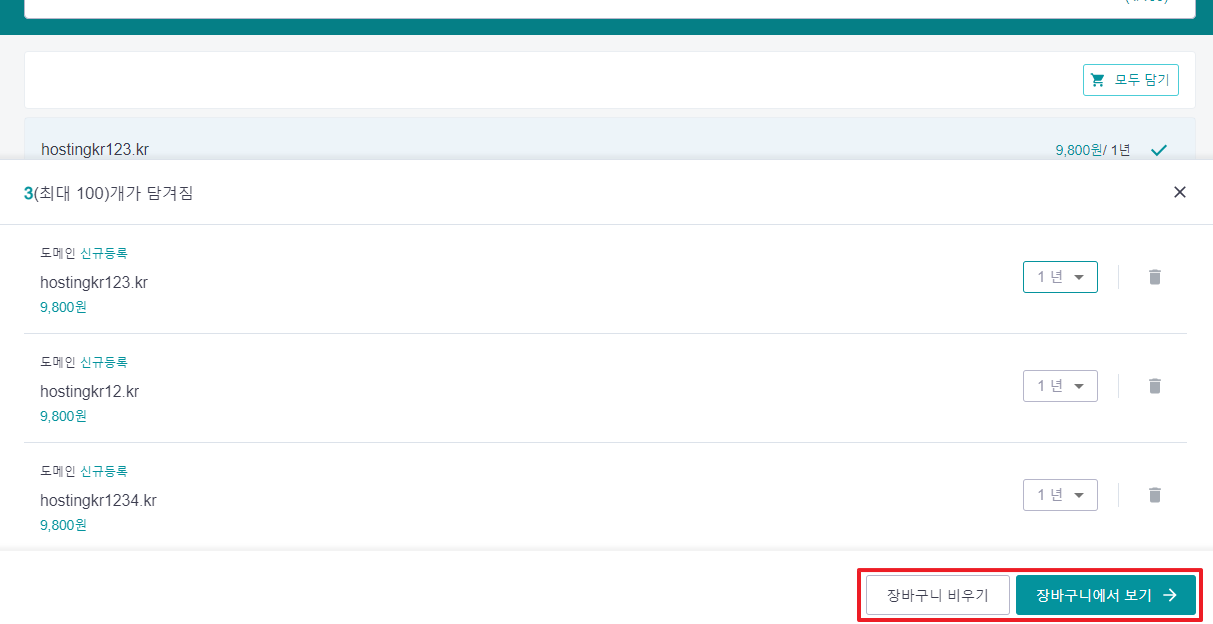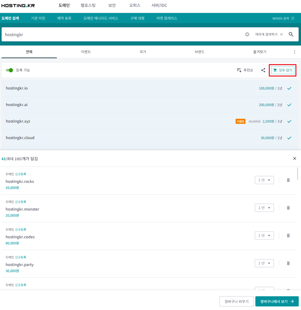 [개선된 기능]검색 결과에서 등록가능한 도메인 ‘모두 담기’ 기능 제공
