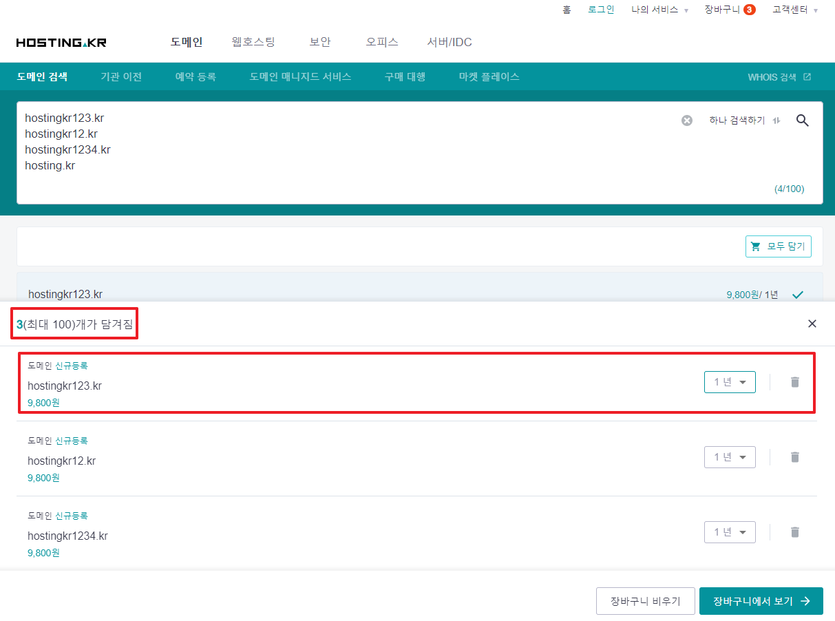 즐겨찾기, 여러개 검색과 같은 결과 페이지에서 원클릭 버튼을 통해 구매를 원하는 도메인을 장바구니에 한번에 담을 수 있습니다.