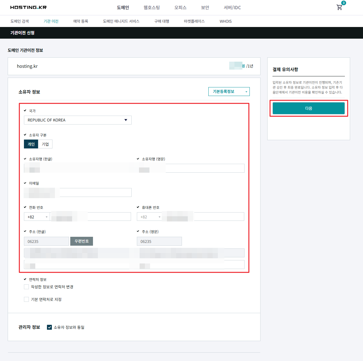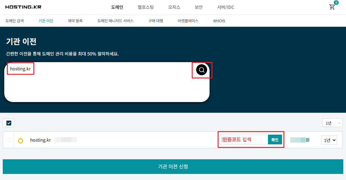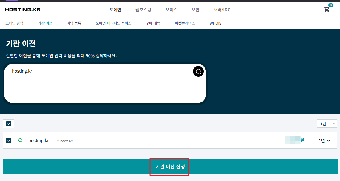 호스팅케이알로 기관이전을 신청하고 싶어요.