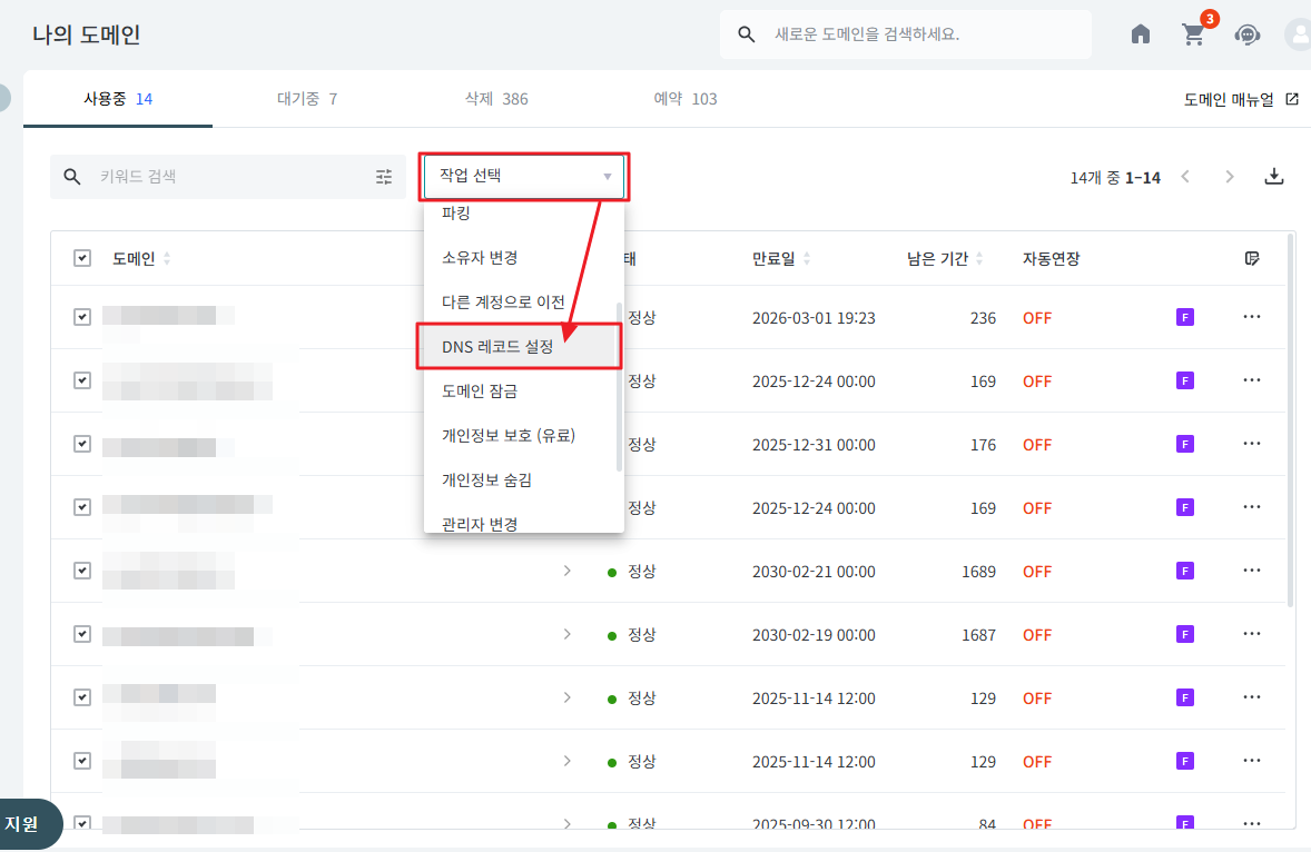 2. 일괄로 변경할 도메인을 체크한 후 작업선택 > DNS레코드 설정을 클릭합니다.